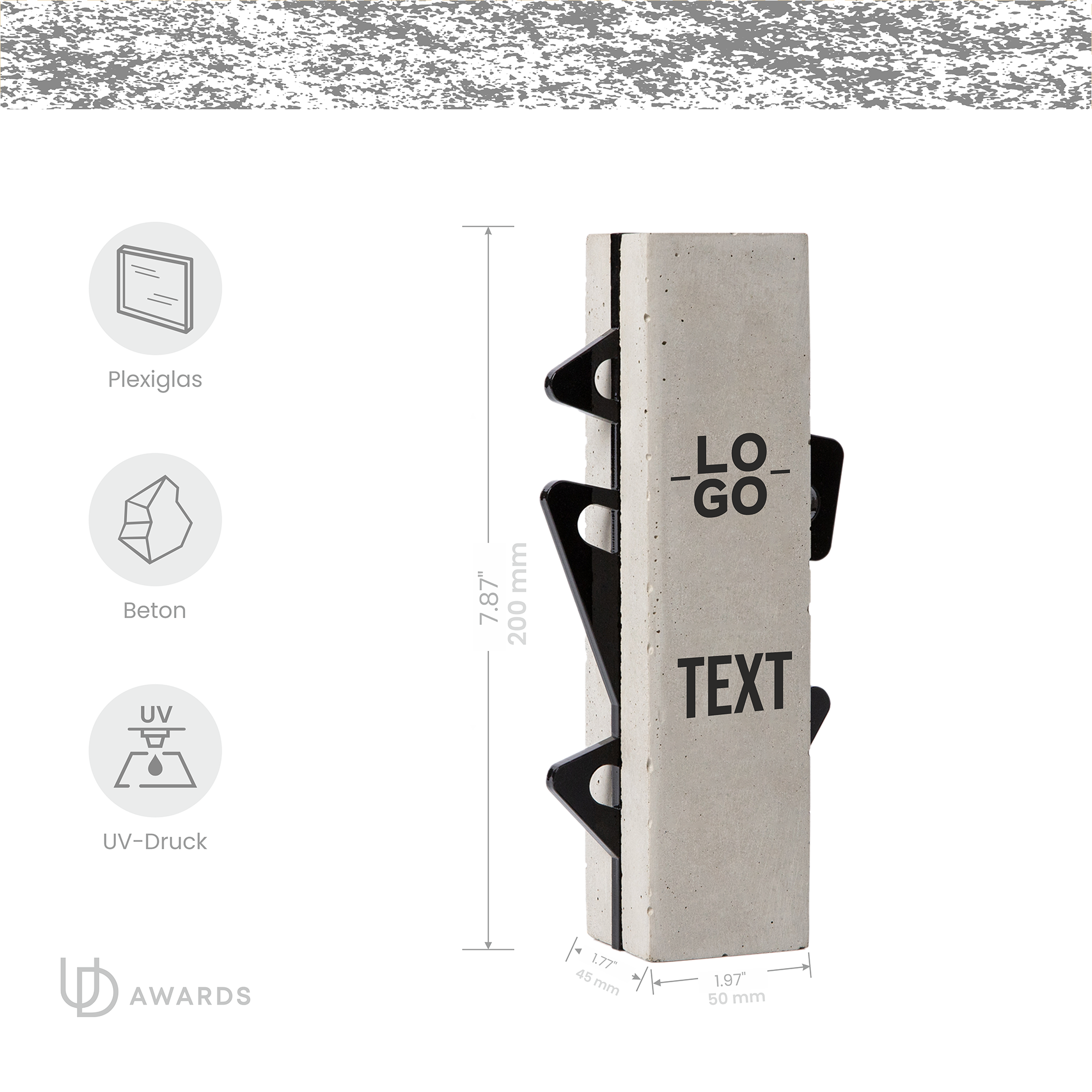 Eine auffällige Betontrophäe mit markanten schwarzen Plexiglasakzenten für einen modernen, industriellen Look.