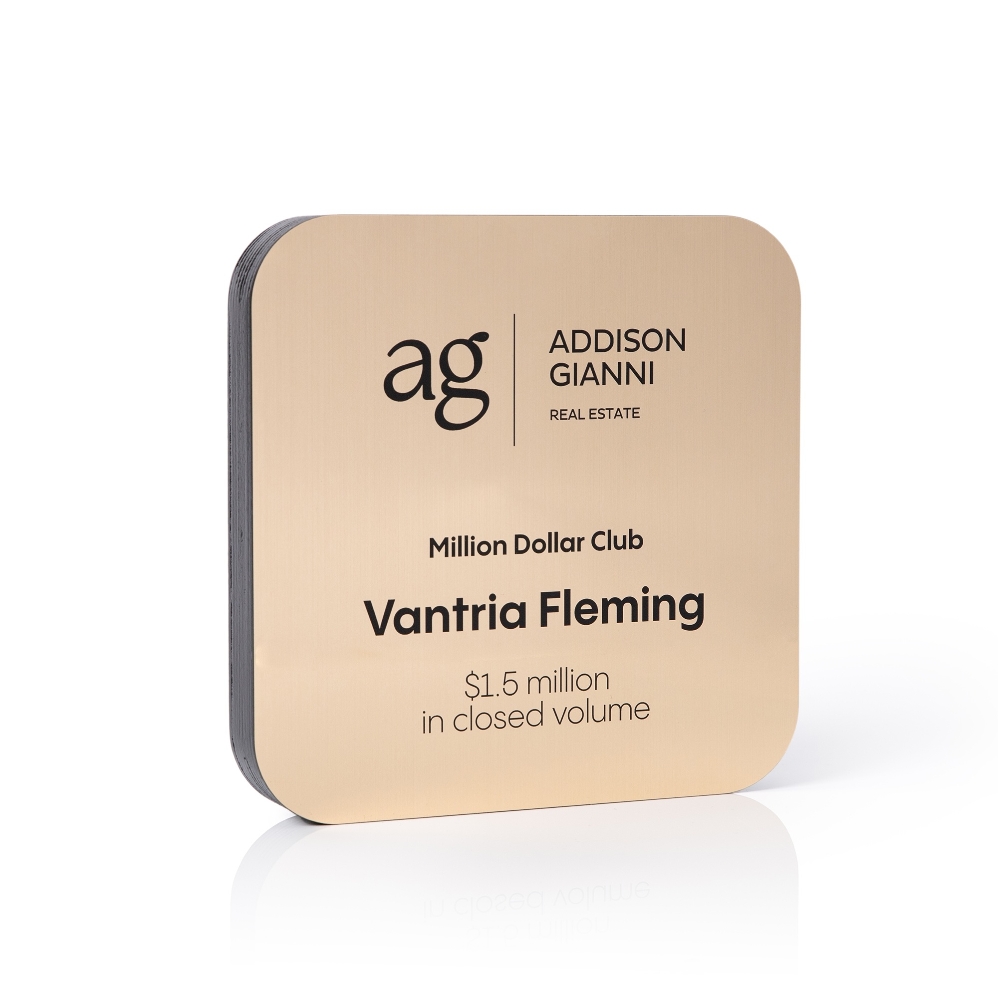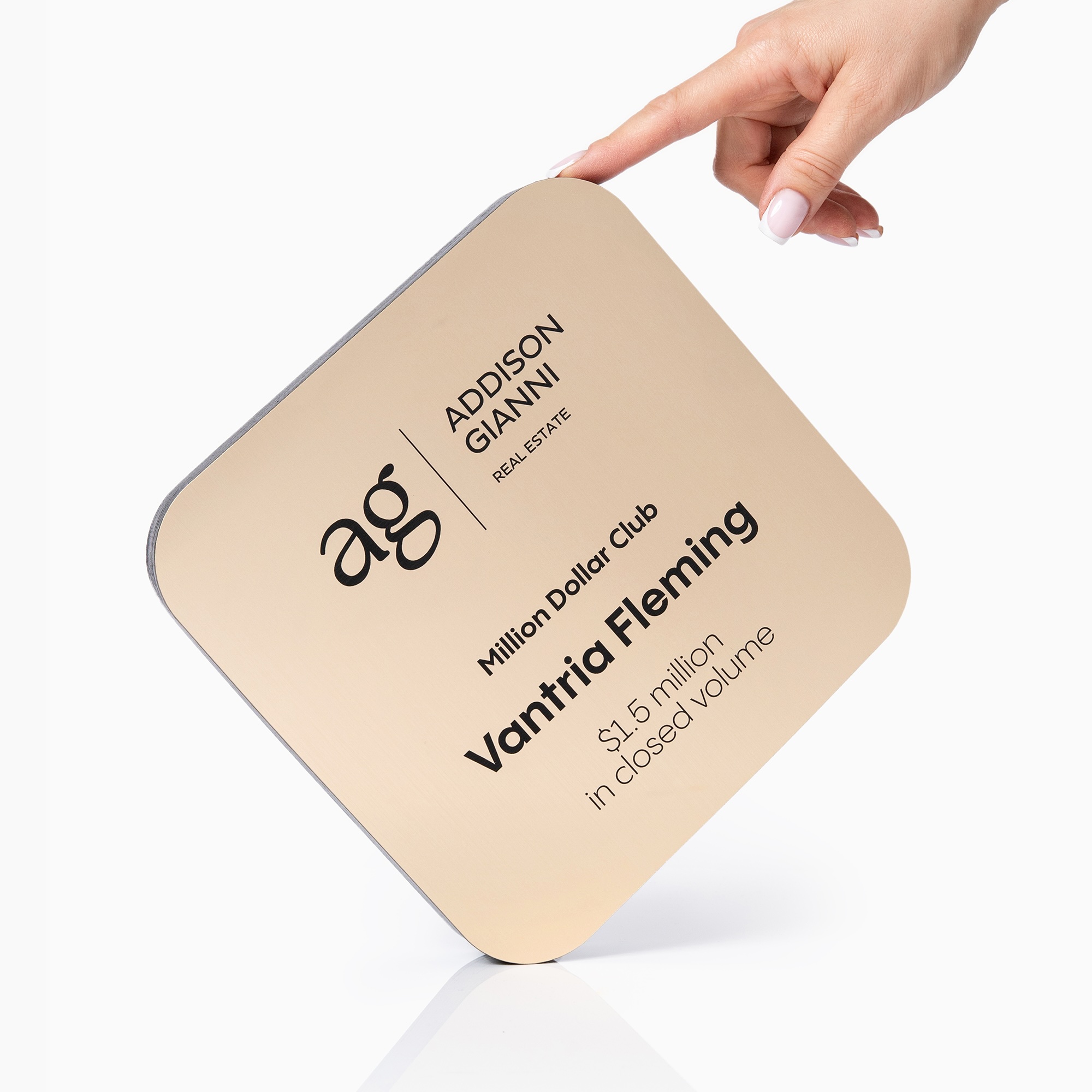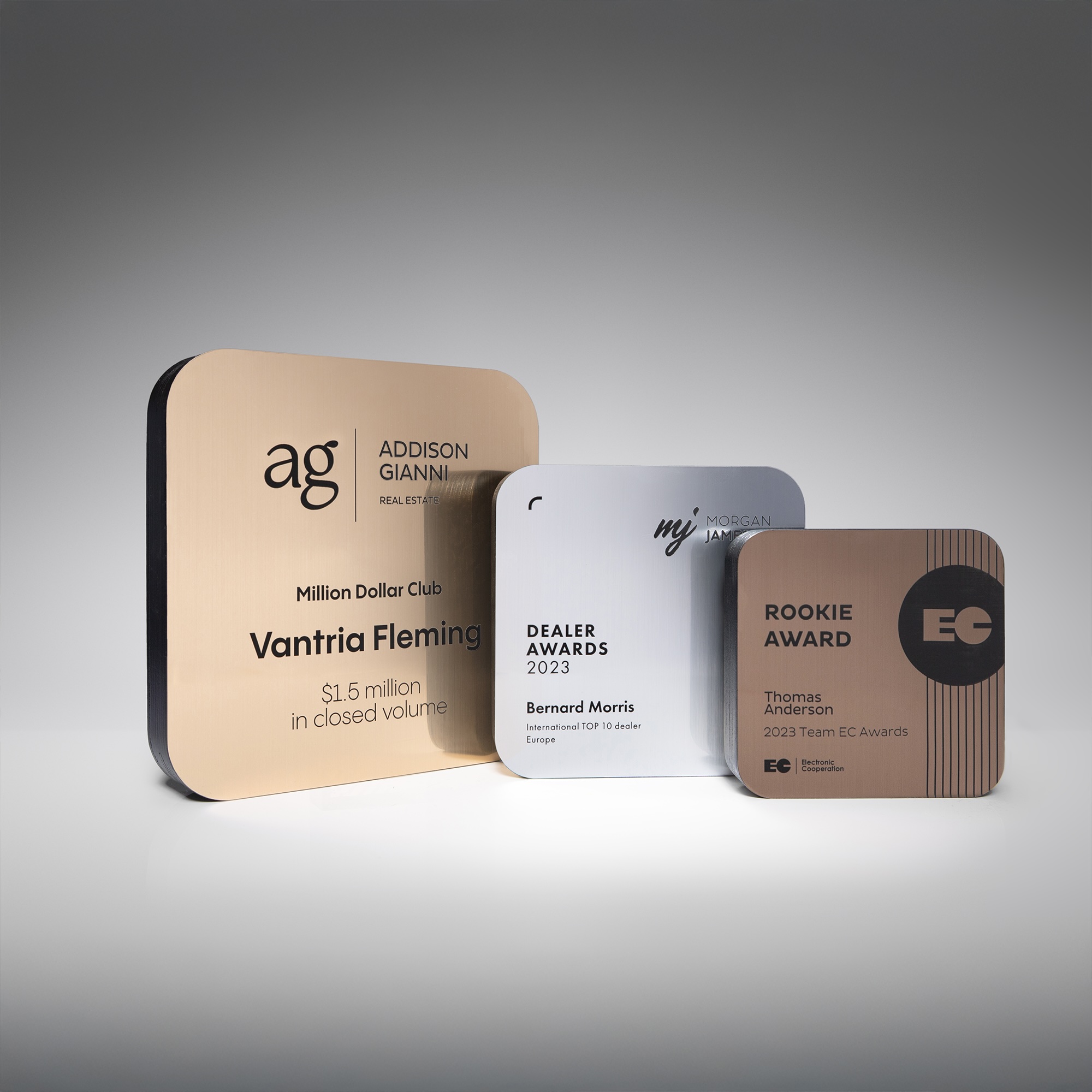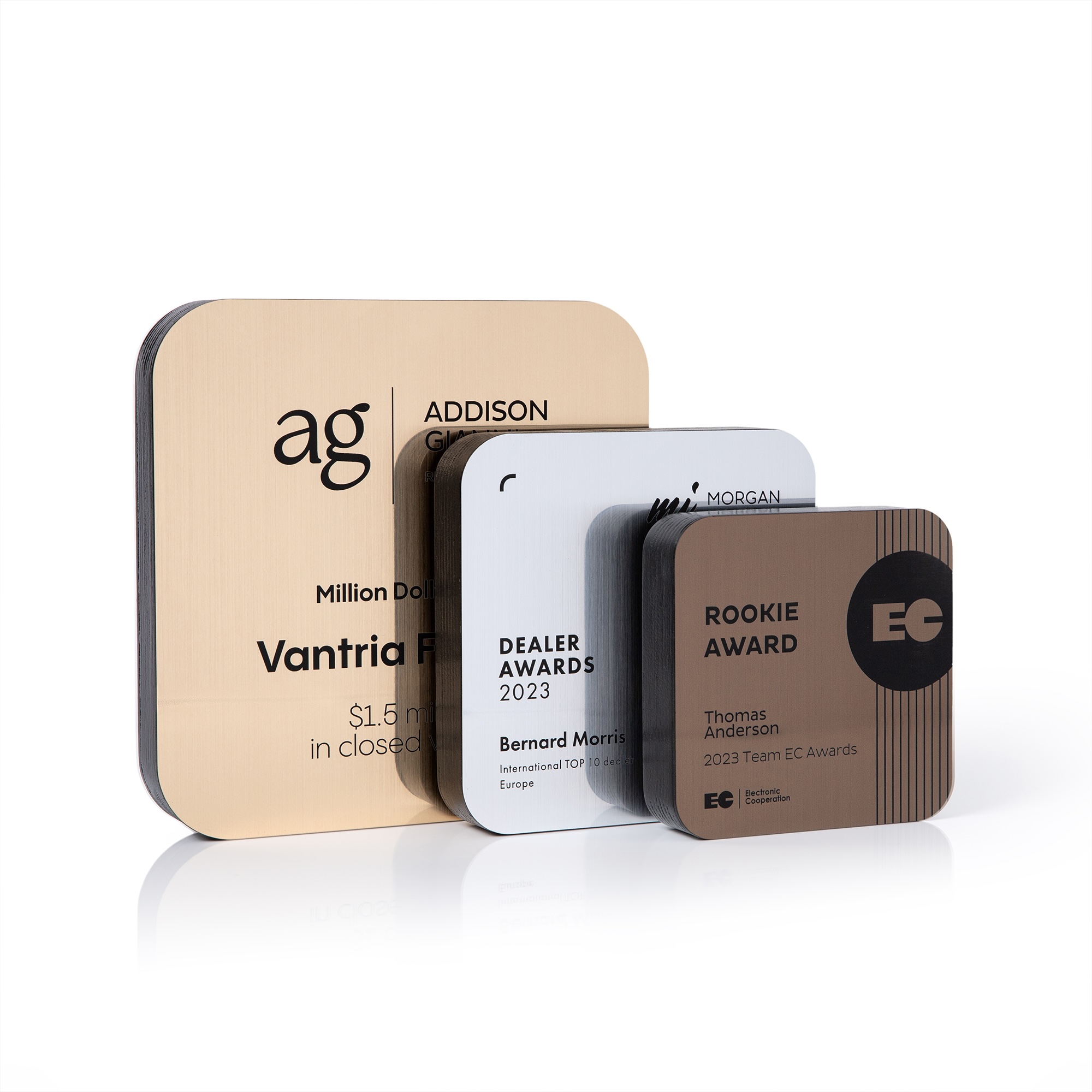 Das minimalistische quadratische Design mit präziser Lasergravur sorgt für eine professionelle und moderne Optik. Ideal für Unternehmensauszeichnungen, Händleranerkennungen oder Meilenstein-Erfolge. Erhältlich in Gold, Silber und Bronze aus Flexibrass.