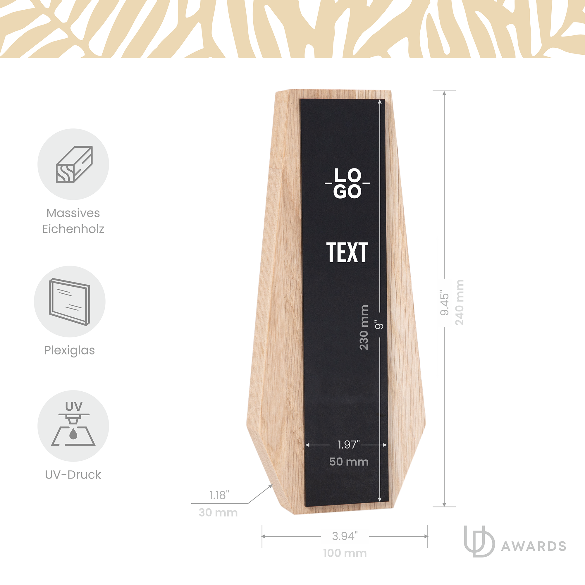 Eine markante geometrische Auszeichnung aus massiver Eiche mit FlexiBrass-Details – ideal zur Ehrung von Führungsqualitäten, Exzellenz und Engagement.