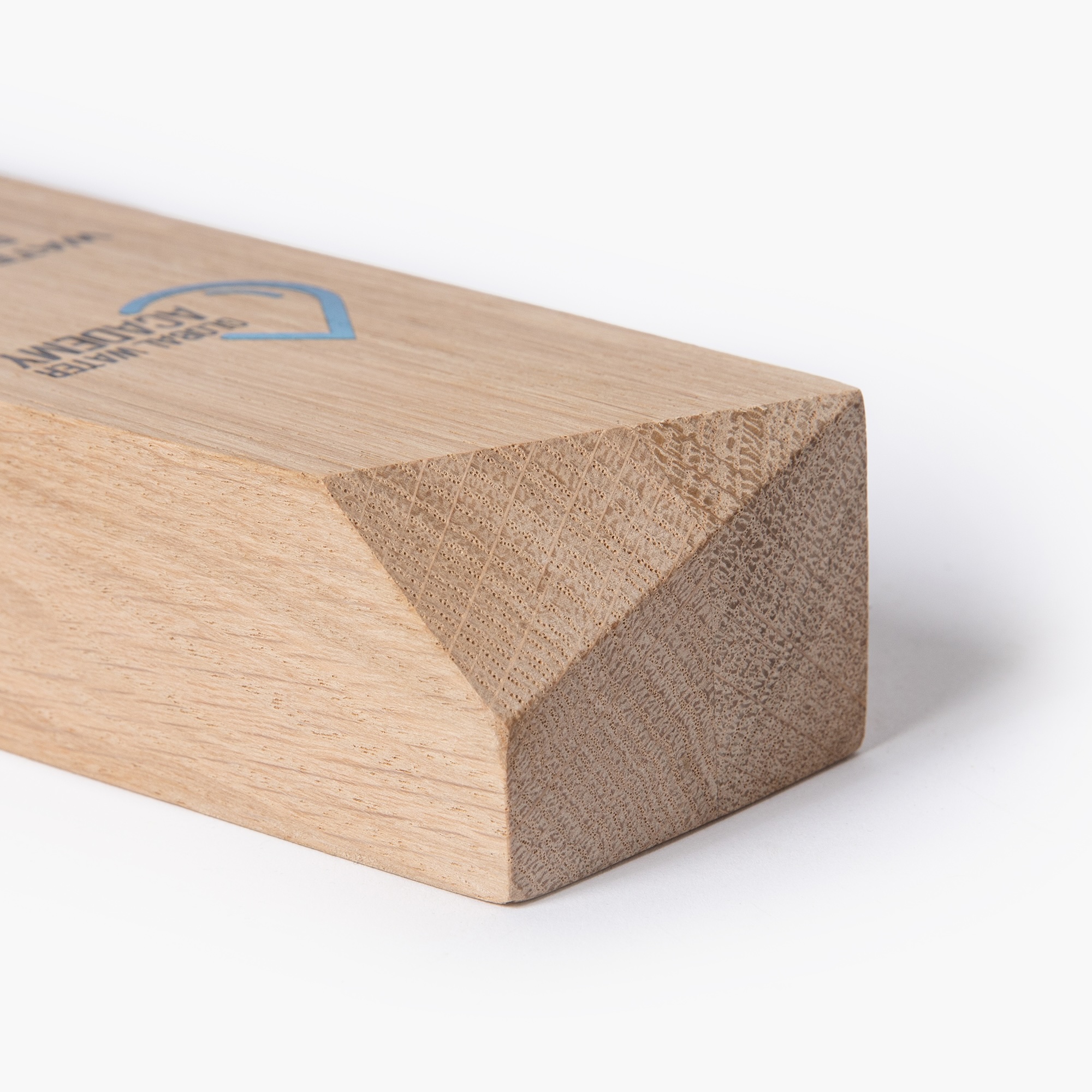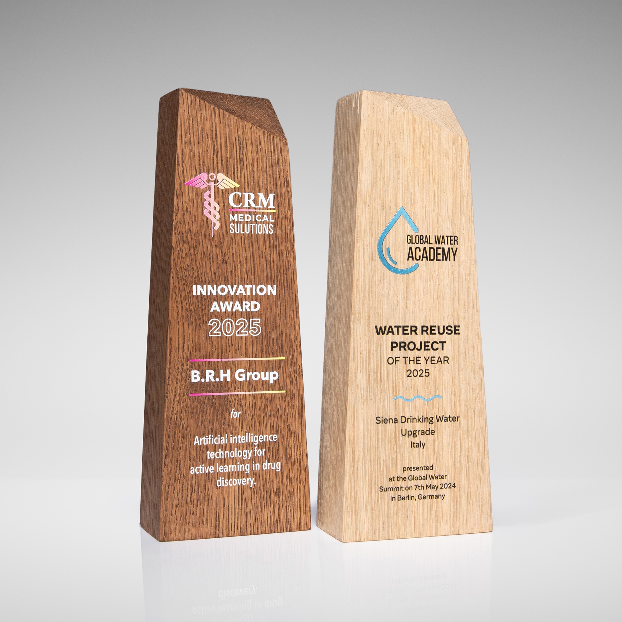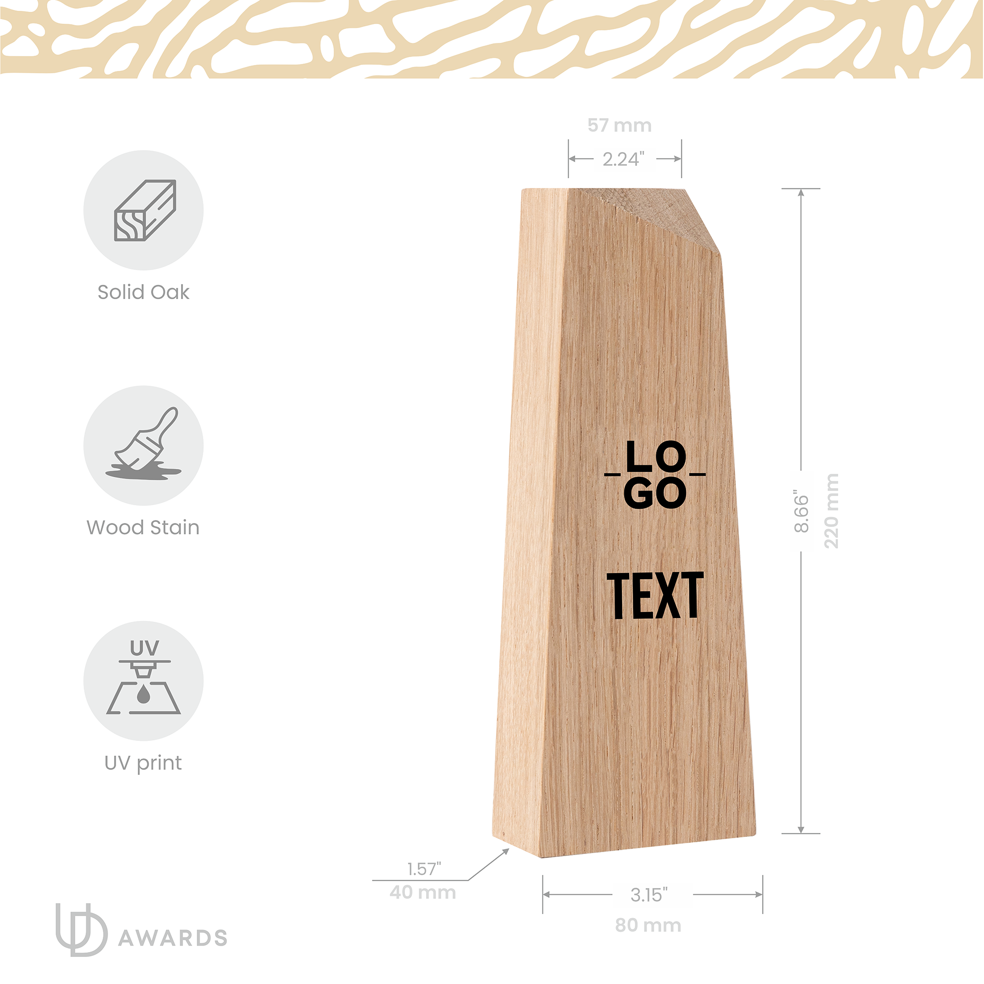 This minimalist wooden award with a slanted peak is designed to honor achievements with elegance and timeless natural beauty.