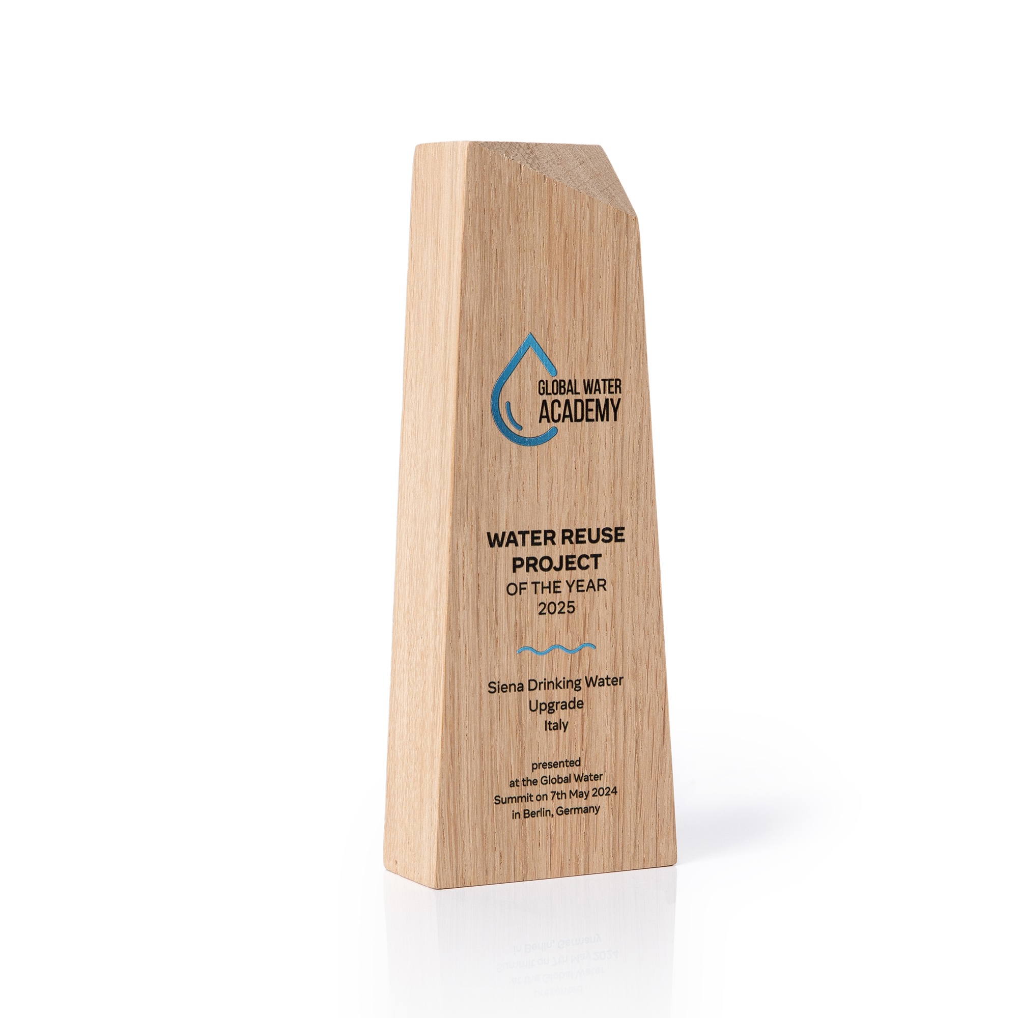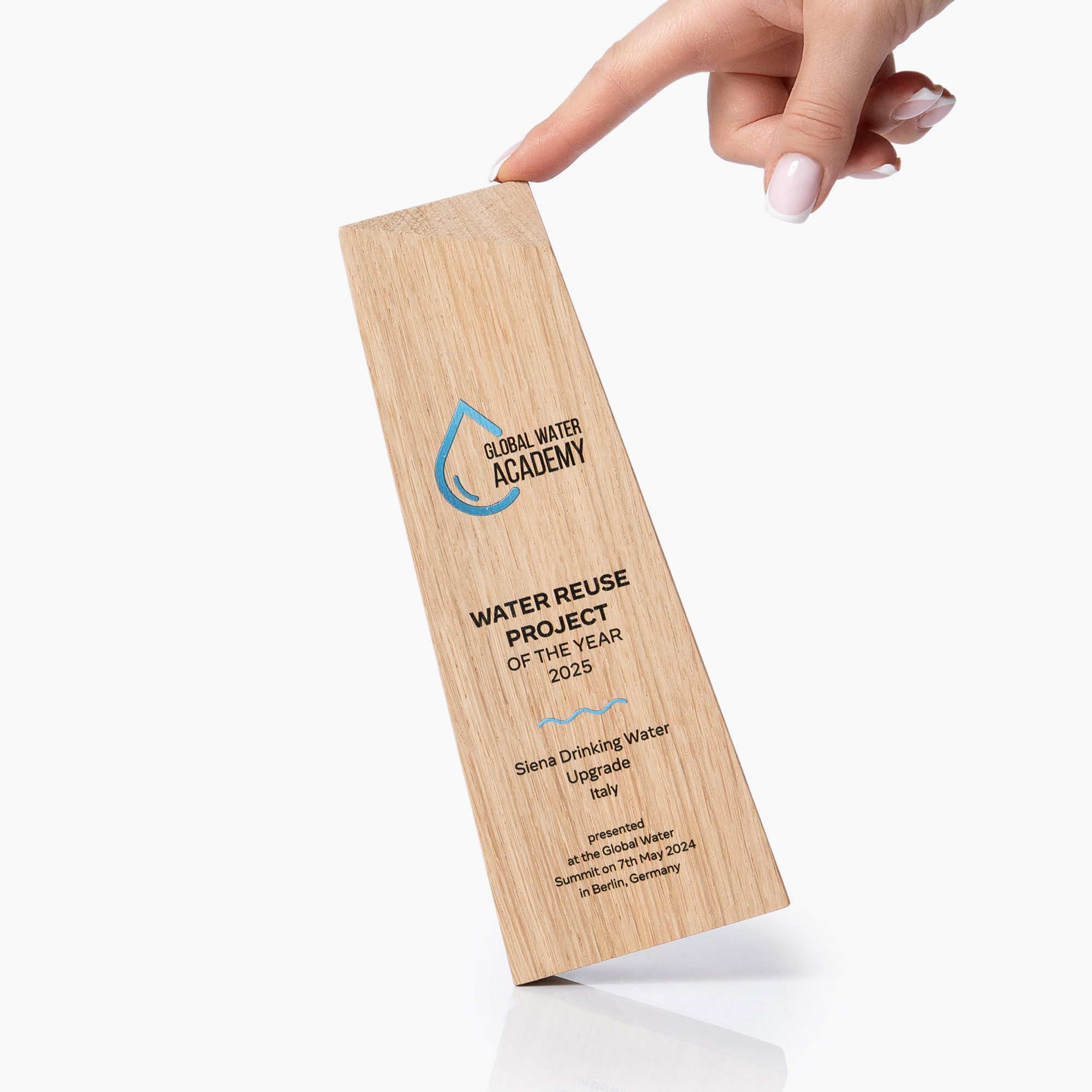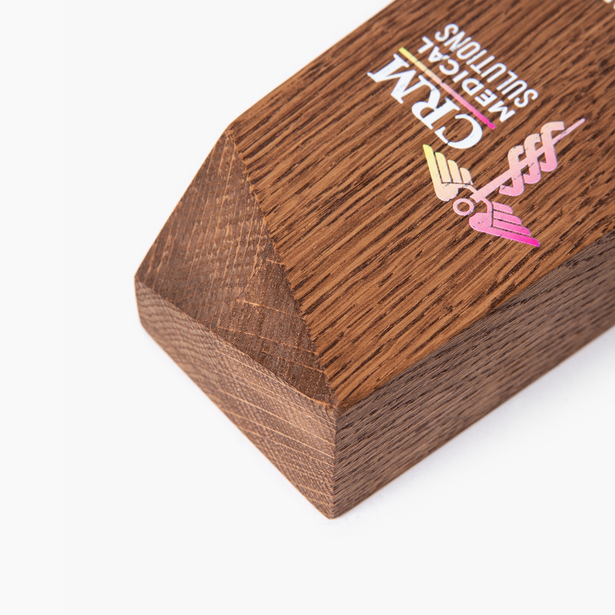 This minimalist wooden award with a slanted peak is designed to honor achievements with elegance and timeless natural beauty.