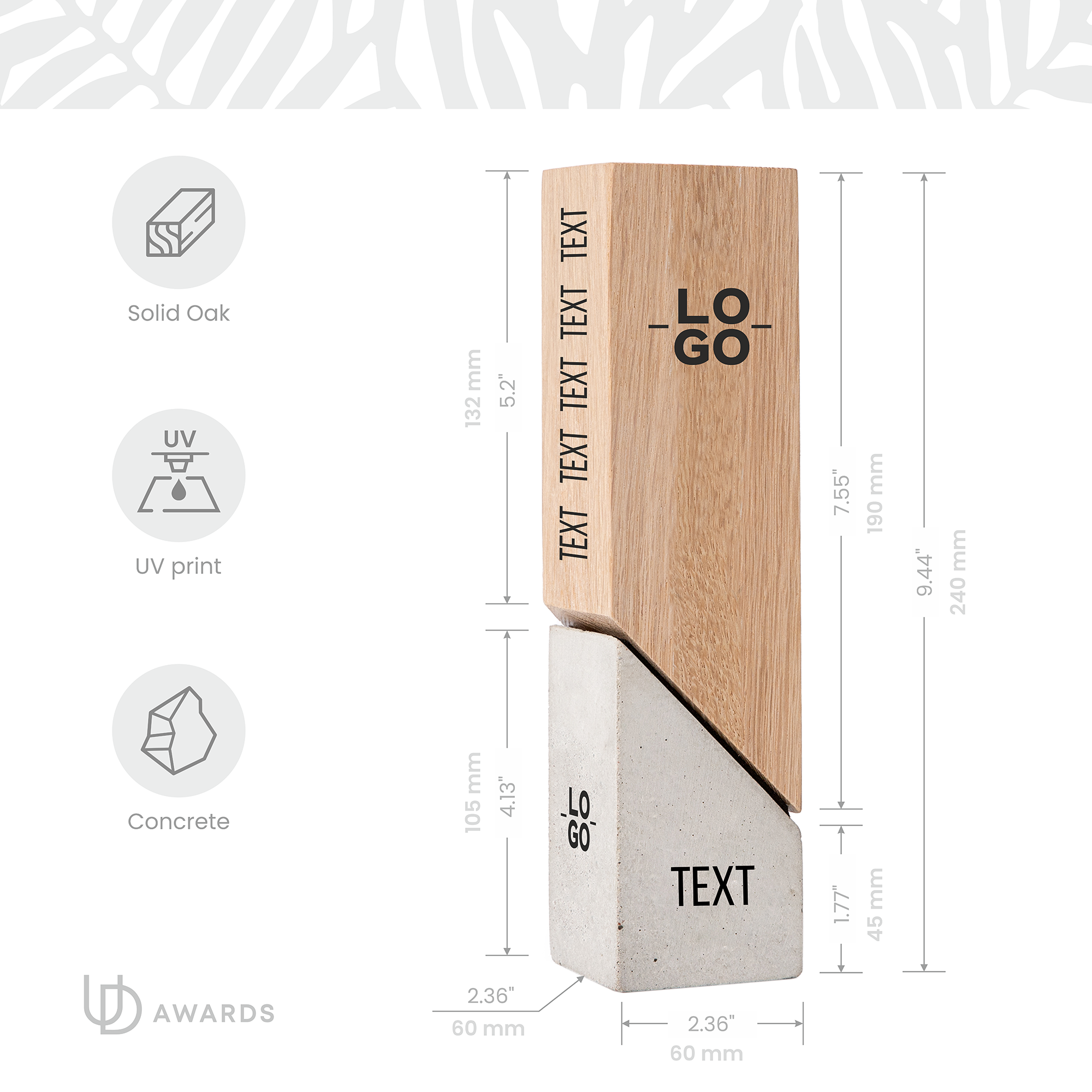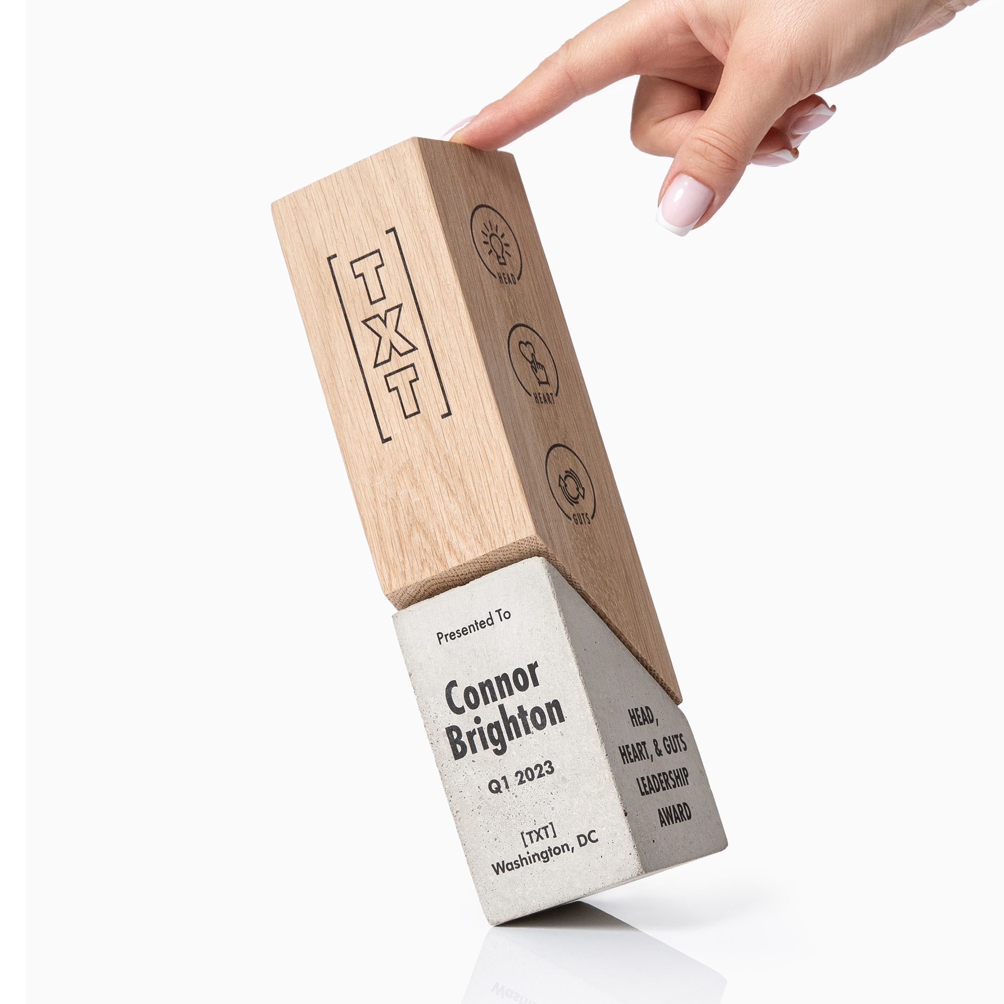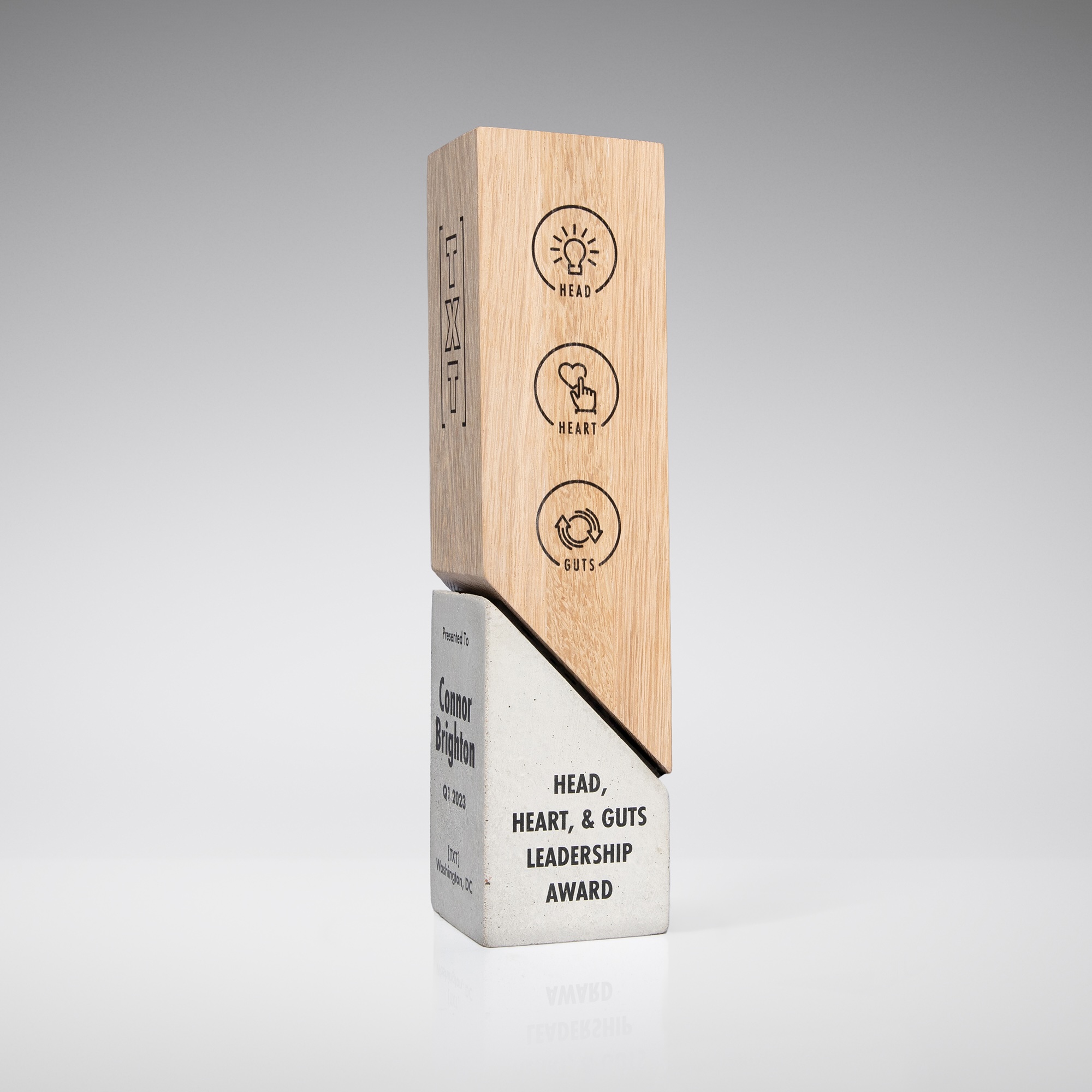 A modern award that blends raw concrete with natural oak – perfect for honoring bold leadership and visionary achievements.